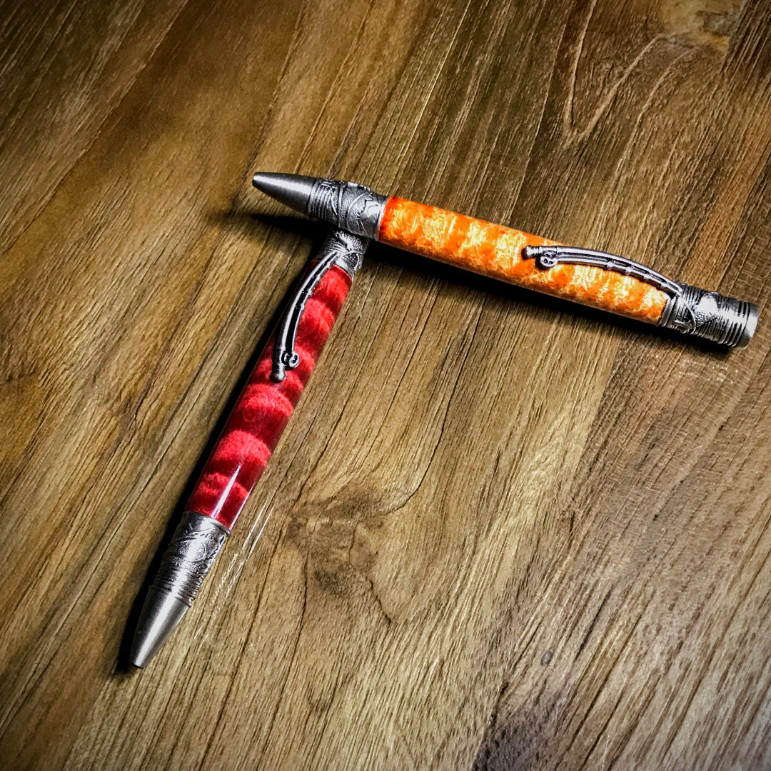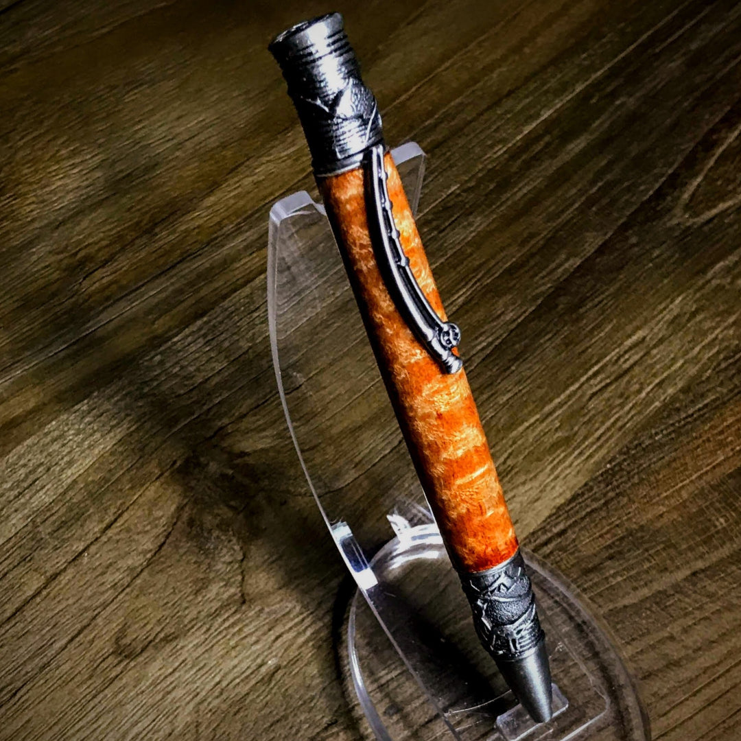 The Fish On! Fly Fish Pen takes your passion of fly fishing right into your office or home or lodge. It features a fly rod pen clip, which aligns with the fly line reeling in a fish. The pen tip features the quiet scene of a day on the river.