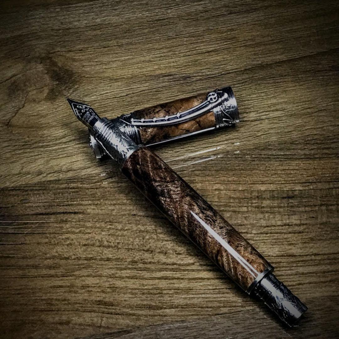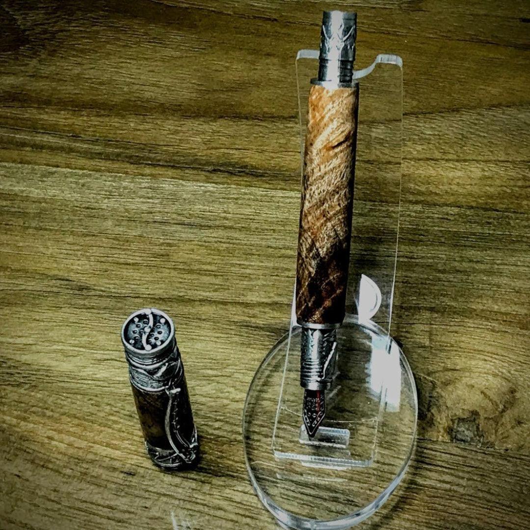 Antique Pewter Fountain Pen Big Leaf Maple Burl Black / Red