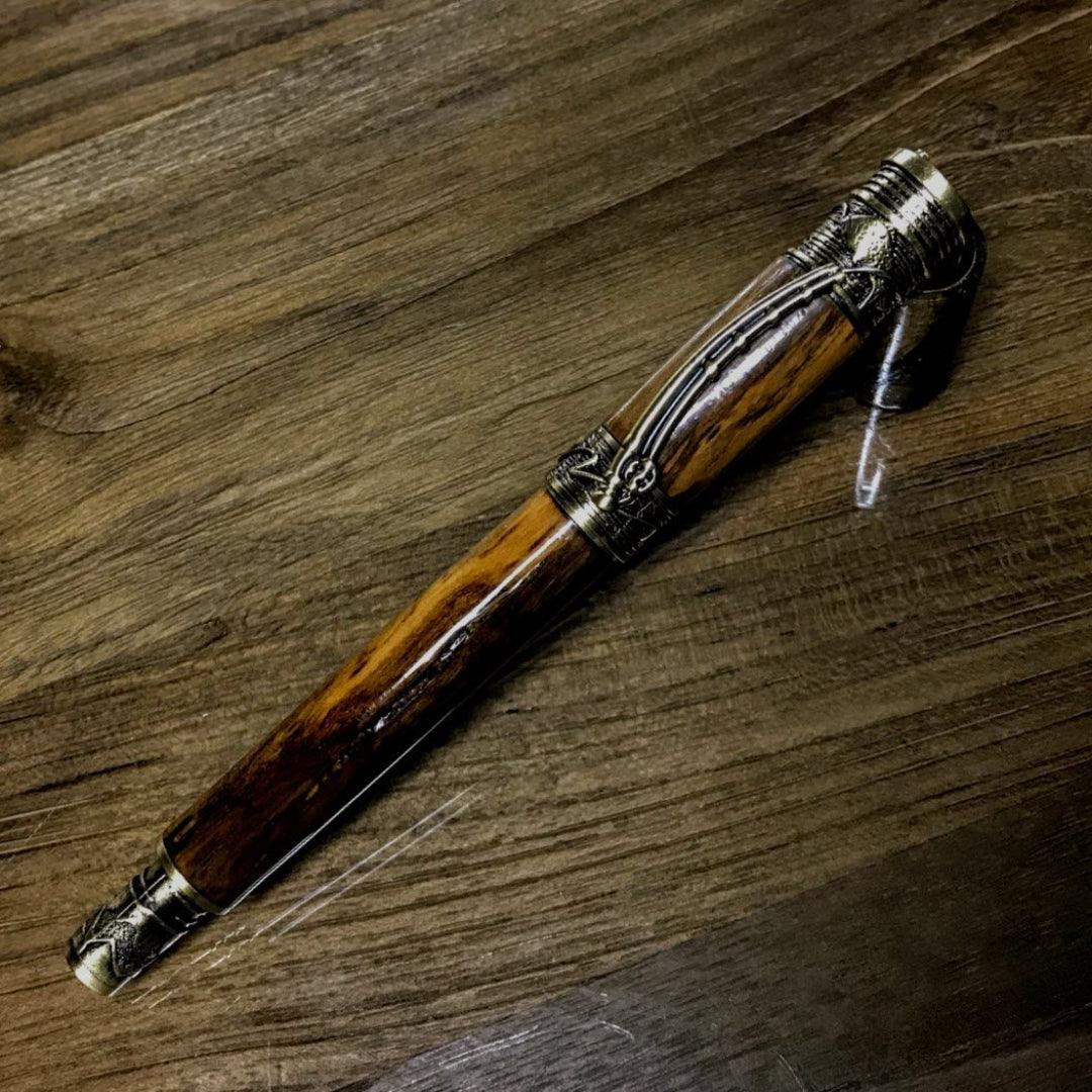 The Fish On! Fly Fish Pen takes the sport of fly fishing right into your office. It features a fly rod pen clip in an antique brass finish, which aligns with the fly line reeling in a fish. The pen tip features the quiet scene of a day on the river.