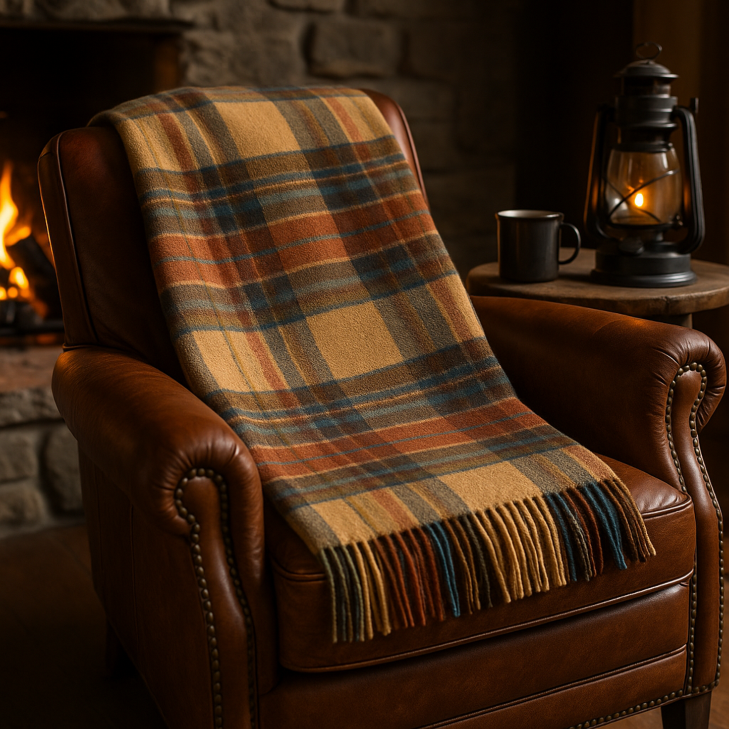 Highland Tweeds Shetland lambswool throw in Antique Dress plaid with fringe – tan, russet, blue