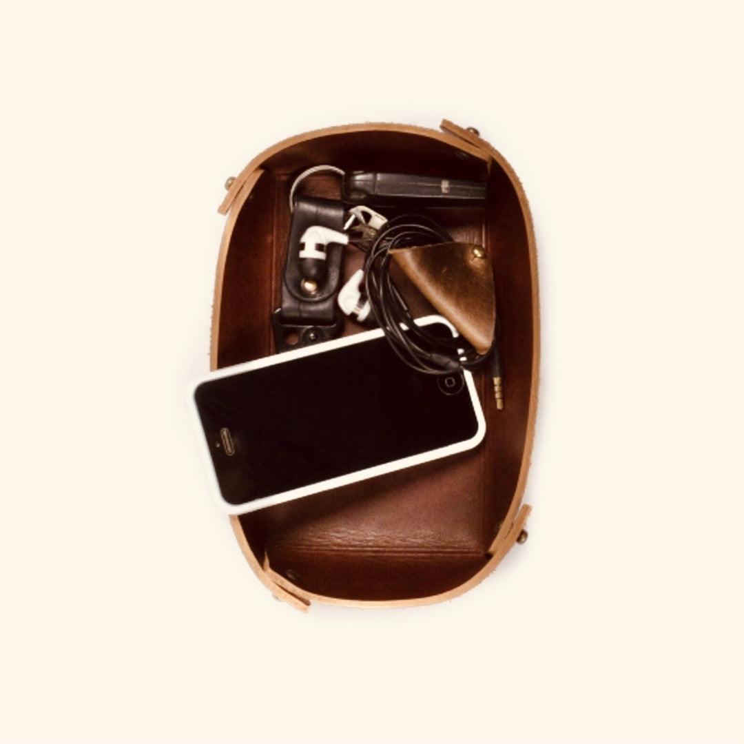 Introducing the Basin Leather Catch-All, the perfect solution for organizing your home or office in style. This beautiful and durable leather tray is designed to catch all your essentials in one place. With its collapsible design, it's perfect for storage or travel. The rich leather finish adds a touch of class to any space, making it a stylish and functional addition to your home or office.