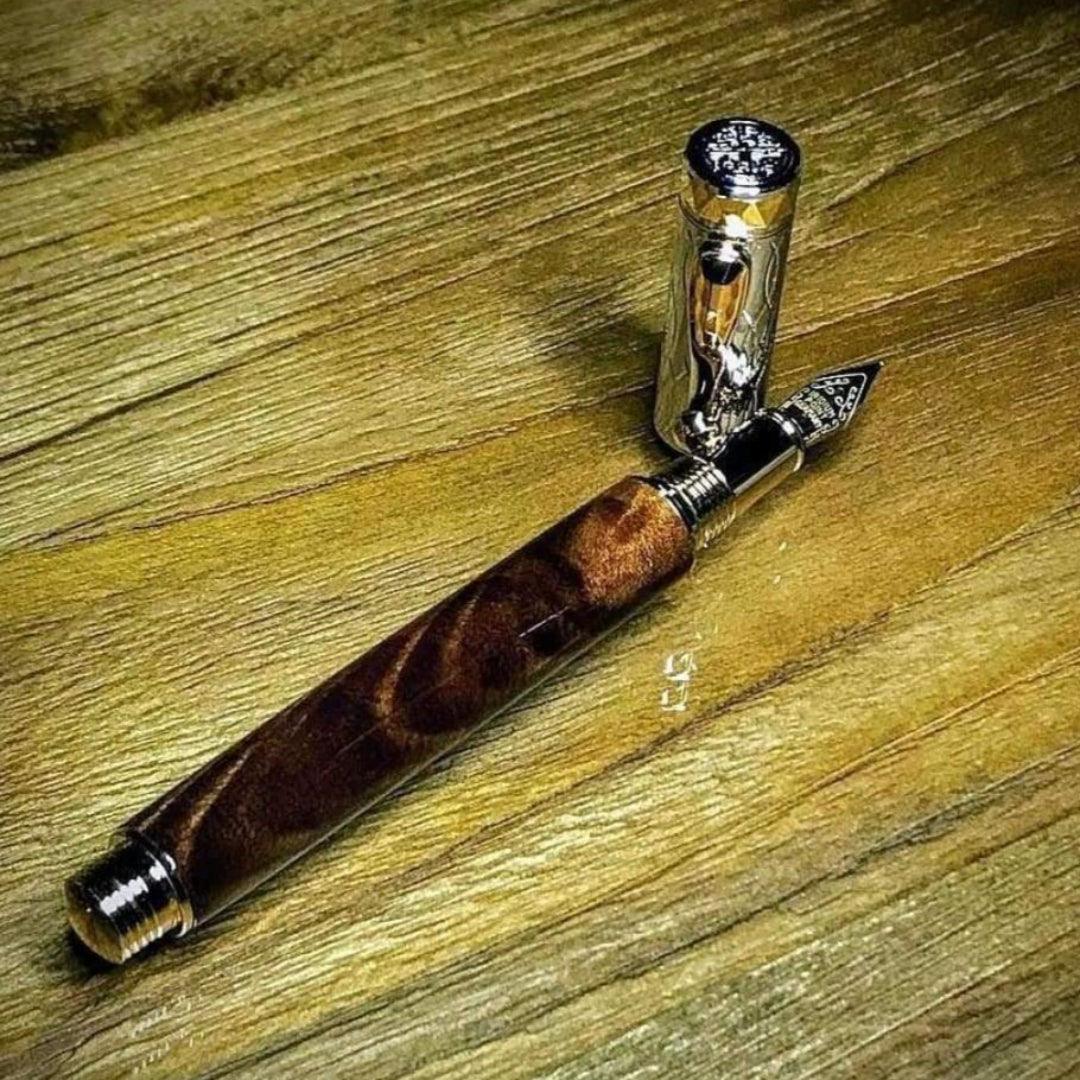 This pen was created with a beautiful piece of Claro Walnut. Claro Walnut, California Black Walnut can range from a lighter, pale brown to a dark chocolate brown with darker brown streaks. Color can sometimes have a gray, purple, or reddish cast. Sapwood is nearly white.