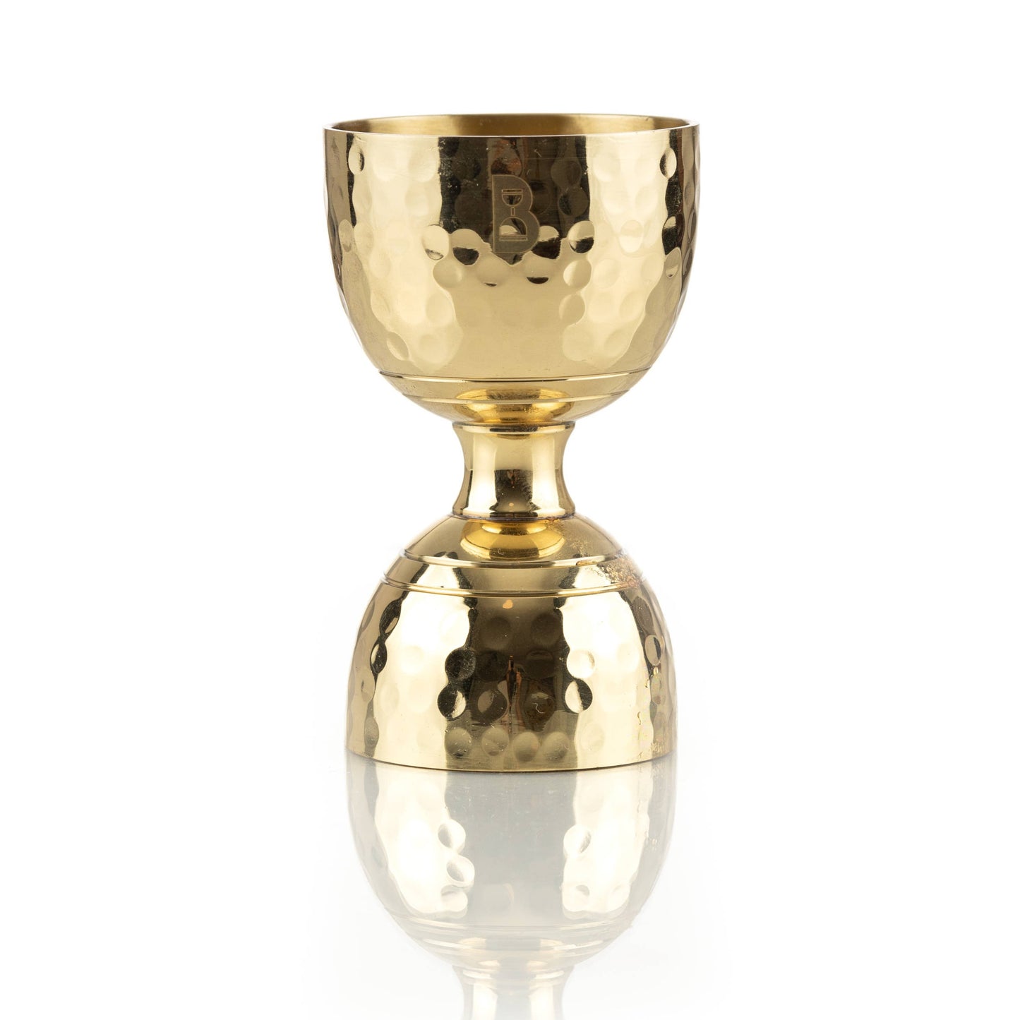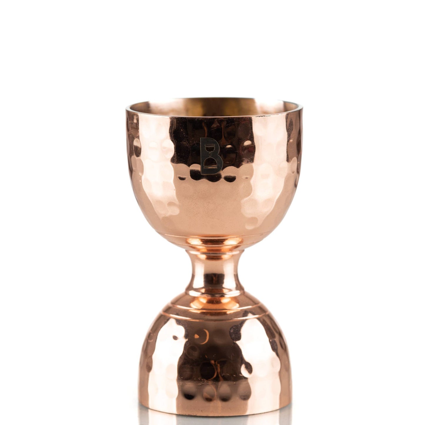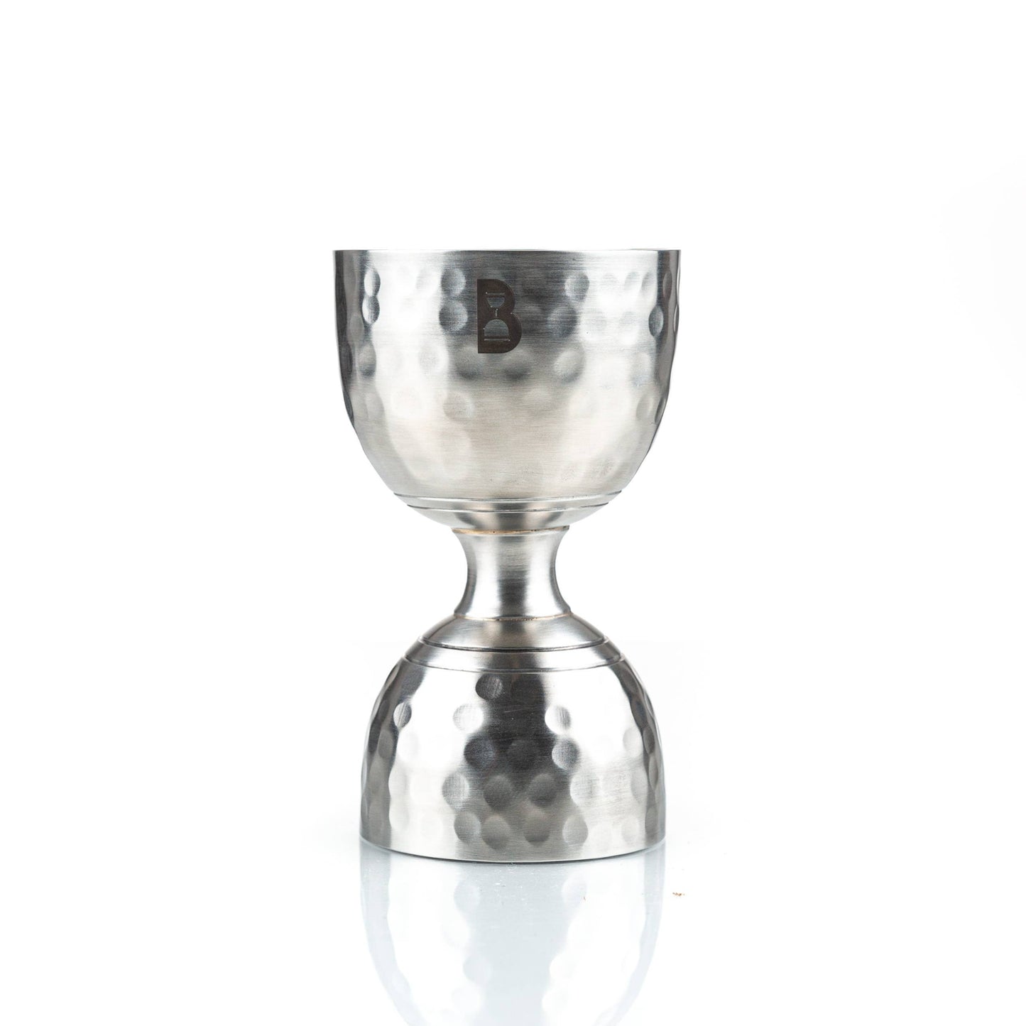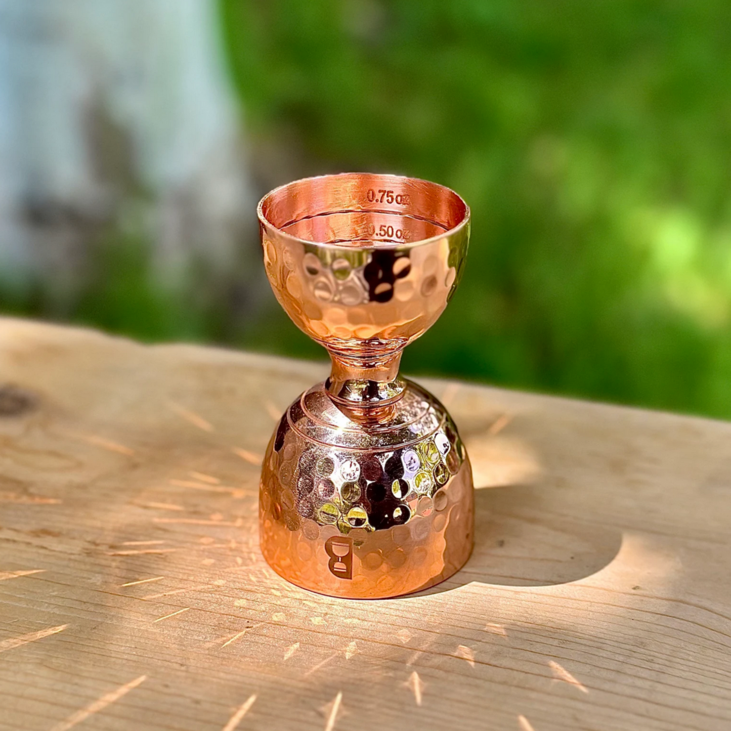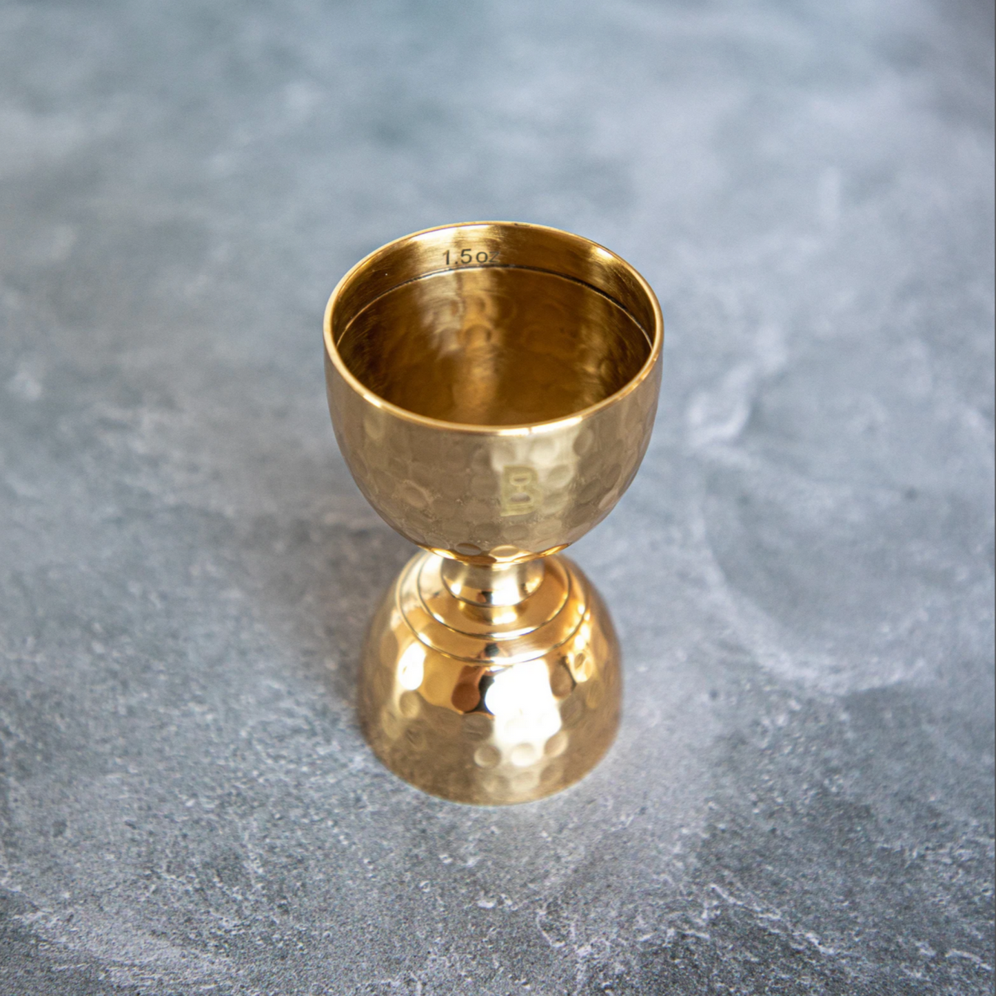 Introducing our stylish and functional Hammered Bell Jiggers. These jiggers not only feature precise 2oz/1oz measurements, but they also add a touch of elegance to any bar setup. Made with 100% brass or copper, they are durable and free of any lining or chipped paint. Elevate your cocktail making skills with our hammered jiggers.